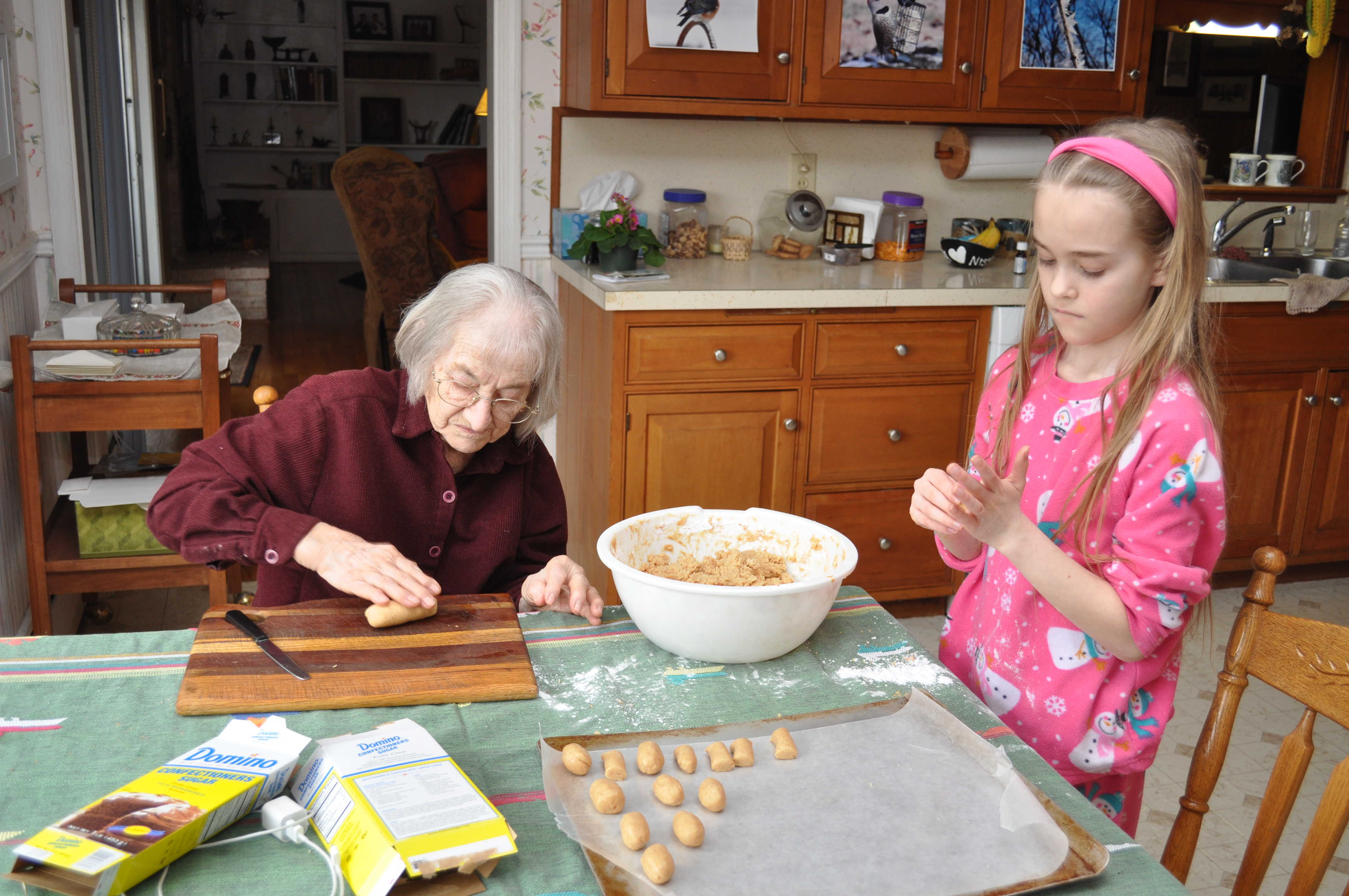 Yummy!! Easter eggs lovingly made. Mother and Elizabeth roll the peanut butter eggs. This is just before Anna Ruth fell and fractured her left wrist, now in a splint. As I write, the eggs do not have their chocolate covering. Can I possibly do that?