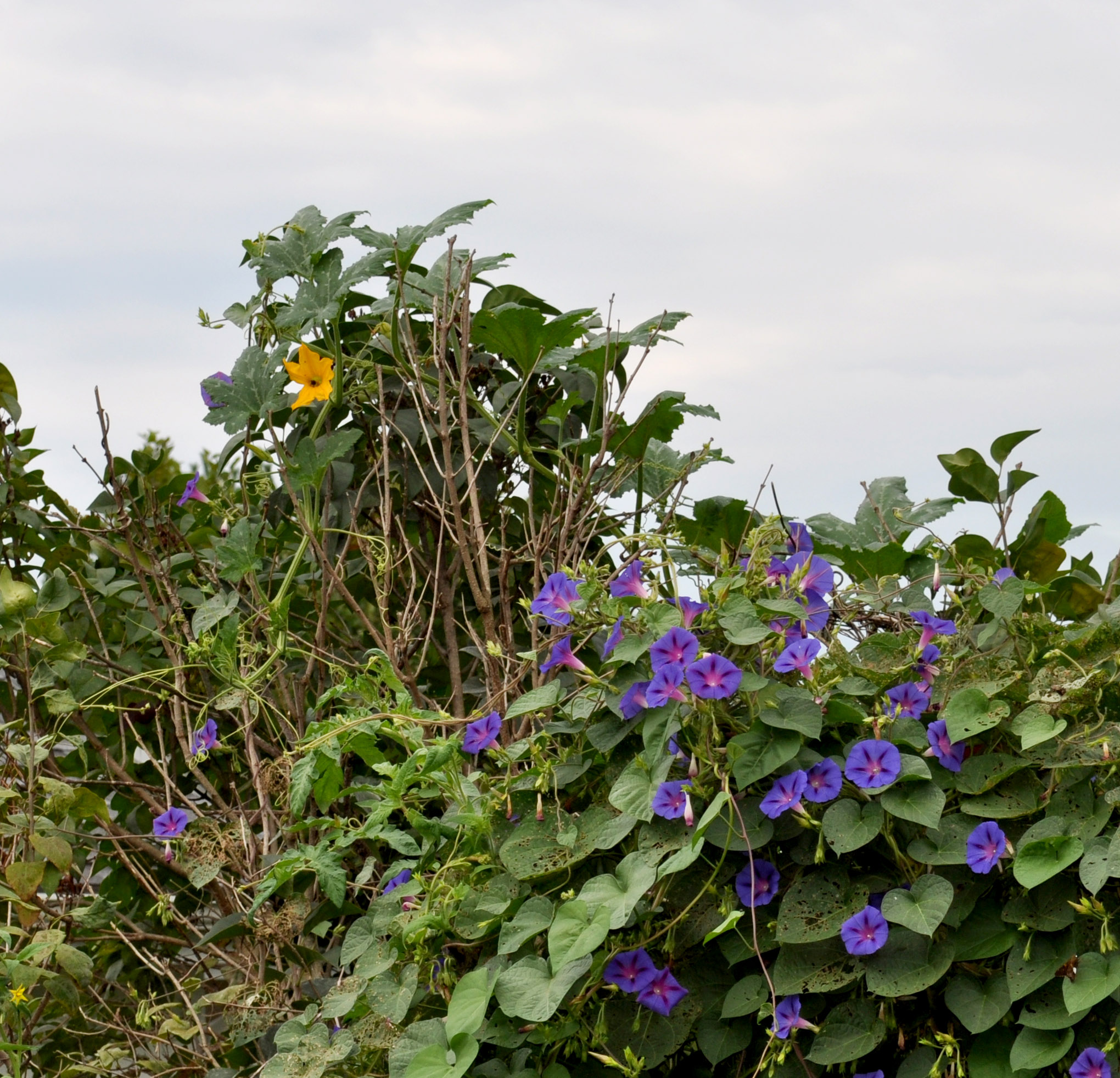 Things do get out of hand. Our morning glories are ten feet high. How is it that there is a yellow blossom way up there above all others? It is that maverick squash plant that sprang up beside our compost box. It grows inches a day! If we are not careful it will invade our house! We have no idea what squash it is. Here is one.