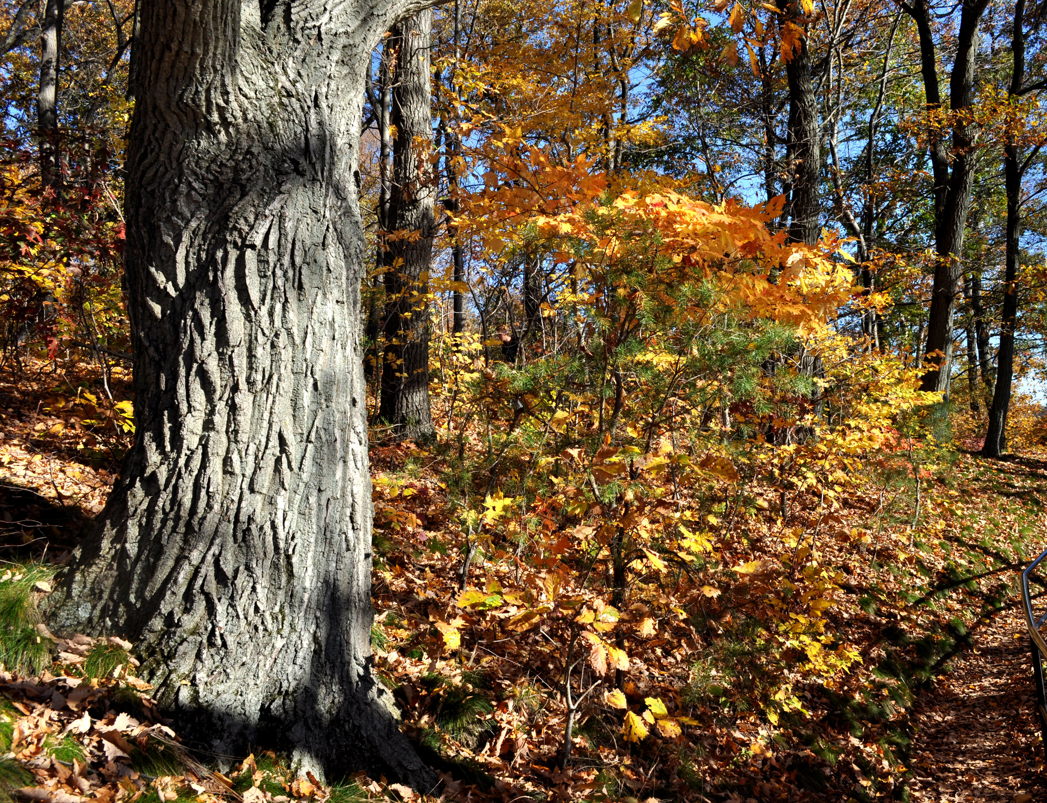 On top of the Chiques Rock on the river lookout. I am impressed with the deep channeling on the sturdy oak contrasted with nothing but promise on the little tree beside it.