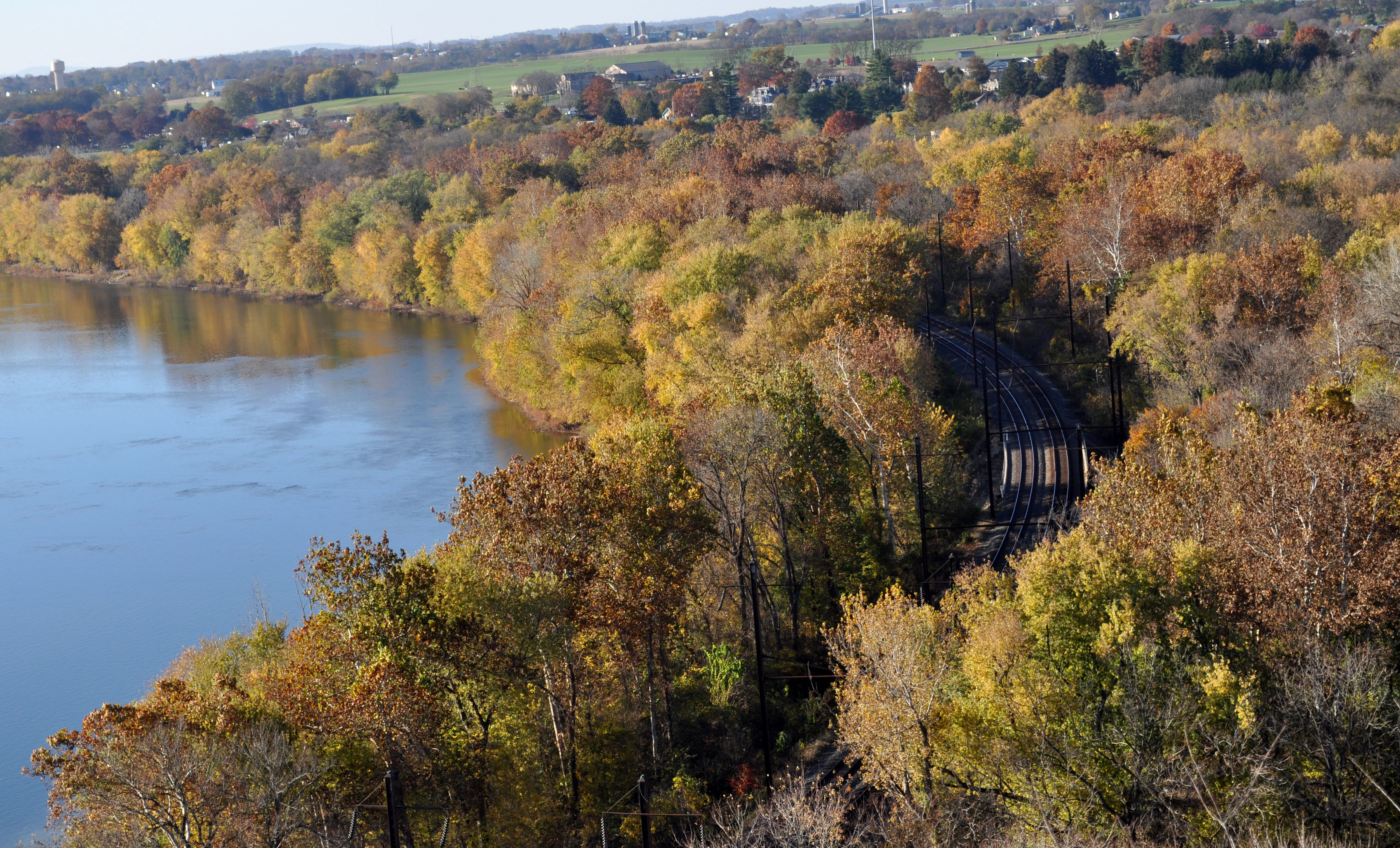 A view from atop Chiques Rock on the Susquehanna River in the splendor of fall leaves. Note the railway tracks along the river. The trains and boats plied this route for many years. The tracks are live and well, the river is used now only by small boats. I am reminded that quite a few people have used this rock to plummet to their death through the years. Not a pleasant thought. Enjoy the colors.